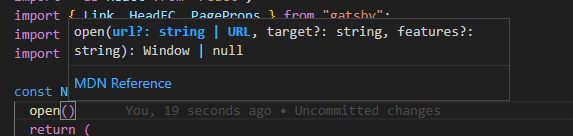 Intellisense also lets you skip having to search documentation all the time. Instead, it will give you the documentation you need right when you need it. It also even lets you search for the operation you want. in the above example, I wrote opand this function was immediately suggested to me, and imported using the auto-import feature. You cans see thatopentakes a bunch of arguments and returns aWindow. This is really useful if you already know what is going on, because you can tell exactly what each parameter should take. If you don't know what is going on, intellisense saves the day with theMDN Reference, which is a hyperlink to here, explaining exactly what that function does! Even better, this works with the docs you write too. If you use the standard documentation format for your language (e.g. jsdoc), this documentation feature will work for your own code, and the code of your teammates. If you use this correctly, your teammates will genuinely love you.