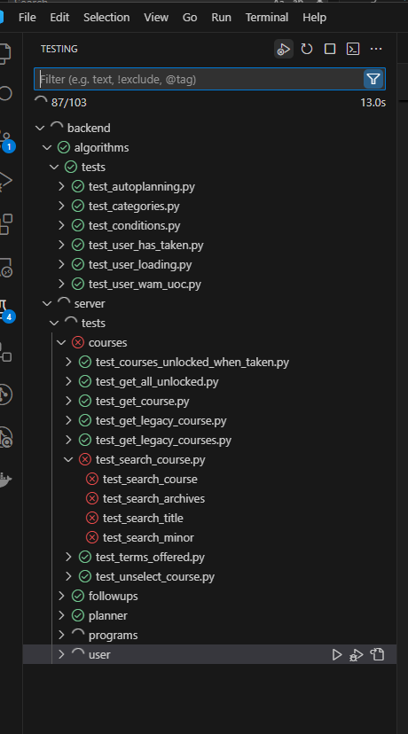 Here, we can see that I can see an overview of all my tests. I can also click the run button and see my tests, and highlighting the failing ones.